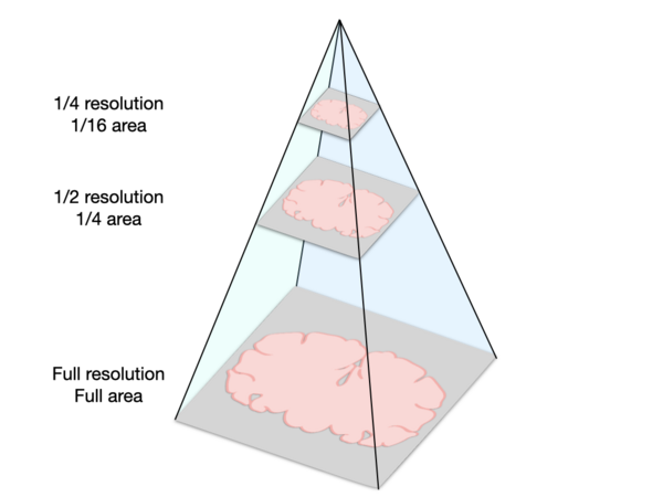 Here is a schematic representation of a pyramidal image, which stores image data at multiple scales to enable quick loading of very large images. These images have two dimensions, so halving the resolution along both dimensions produces images with a quarter of the original area.