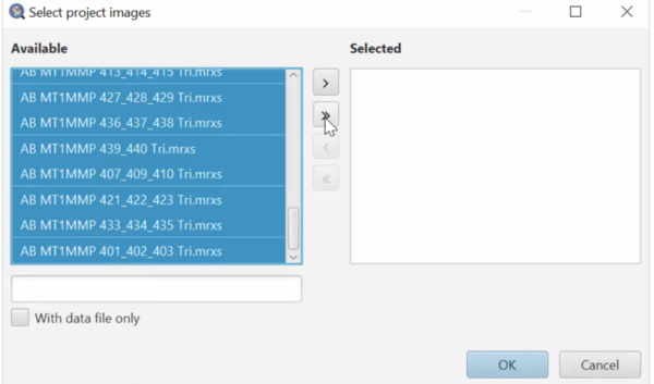 To run the script for many/all images: In the script editor window, select Run > Run for project. Then in the “Select project images” popup (see below), you can select multiple images you’d like to run and add them to the “Selected” list by pressing the “>” button. You can also use the “>>” button to add all images to the “Selected” list. The “<” and “<<” buttons remove highlighted and all images from the “Selected” list, respectively. Remember, images must have annotations or they will be skipped. See below: