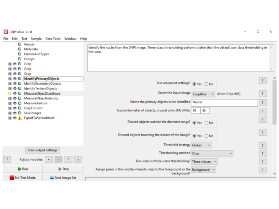 CellProfiler 3.0 looks pretty similar to what you’re used to, albeit a bit sleeker than previous versions. While most of it still behaves exactly how you’re used to from using different CellProfiler 2 versions, the biggest change involves running pipelines in Test Mode- you’ll notice the (beloved or hated, depending on who you ask) slider has not made the jump to 3.0. Instead we’ve gone the much more streamlined route of using the module list itself to indicate where you are in the pipeline- the module you’re currently looking at is highlighted and has its name in bold type. If you’re jumping around through modules and not sure how much of the pipeline you’ve run so far, never fear about forgetting where your place is either- we’ve also shaded in and underlined the next module that will run when you hit “Run” or “Step”.